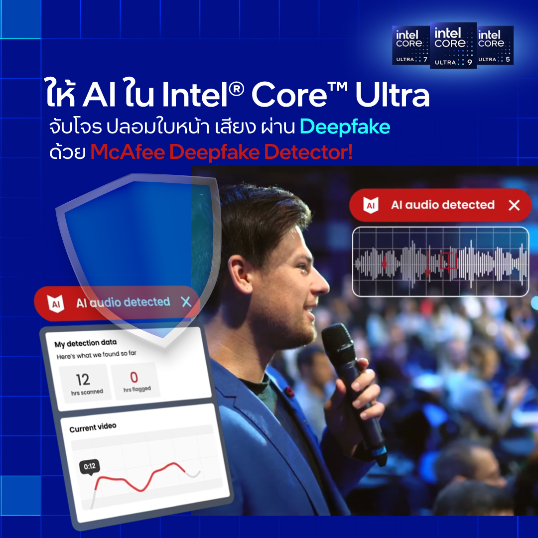 หนามยอกต้องเอาหนามบ่ง วันนิ้ McAfee ได้พัฒนาเทคโนโลยีตรวจจับการใช้ Deepfake ด้วย AI สุดล้ำอย่าง McAfee Deepfake Detector! เครื่องมือตรวจจับวิดีโอ และคอนเทนต์ปลอมต่างๆได้ในแบบเรียลไทม์ ด้วยขุมพลังจากโปรเซสเซอร์ Intel® Core™ Ultra รุ่นใหม่ ที่มีหน่วยประมวลผล NPU ในตัว เพื่อการประมวลผลด้าน AI ร่วมกับ CPU/GPU ในรูปแบบ Local ที่พร้อมทำงานได้อย่างรวดเร็ว ตลอดเวลาไม่ต้องเชื่อมต่อเน็ตเวิร์ค ไม่ต้องโยนข้อมูลไปประมวลคลาด์ สะดวกและปลอดภัย ช่วยกระชากหน้ากาก Deepfake ปกป้องผู้ใช้ไม่ให้ตกเป็นเหยื่อเล่ห์กลมิจฉาชีพ