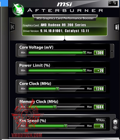 จัดโอเวอร์คล๊อกค่า Core1240Mhz Memory 1684Mhz กันแบบเต็มๆ มาถึงในจุดนนี้ต้องเพิ่มไฟที่ 1.3V ครับเพราะว่ามันเกินลิมิตของการ์ดเดิมแล้วครับหรือพูดง่ายๆคือเฆี่ยนกันแบบสุดๆแล้วเปิดทุกก๊อกกันแล้วครับ ถ้าใช้ไบออสตัวเดิม HD7970 กับความเร็วตั้งแต่ 1200Mhz/1600Mhz+ ดับกลางอากาศไปแล้วครับ อิอิ กำ สำหรับ HD7970ตัวนี้ แต่เมื่อแฟลสแล้วจัดหนัก จัดเต็มได้ เราจัดไปกันเลยครับ