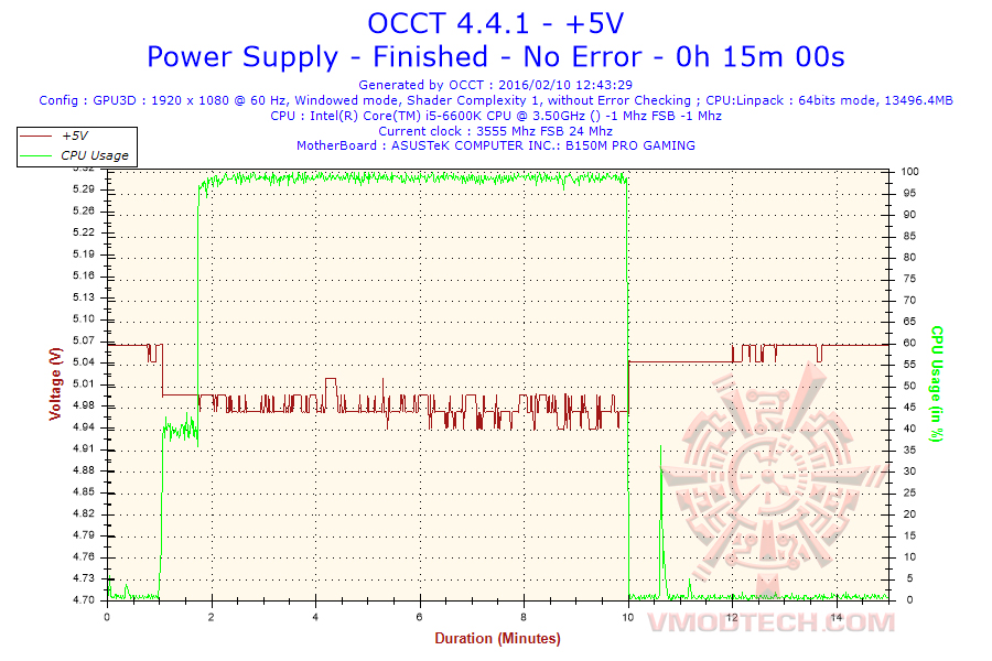ไฟ +5V  ไม่มีโหลดอยู่ที่ประมาณ 5.07V ระหว่างมีโหลดอยู่ที่ประมาณ 4.94V ถึง 5.01 จะมีขยับขึ้นลงบ้างนิดเดียวตามกราฟ อาจจะไม่นิ่งร้อยเปอร์เซ็น แต่ค่าเบี่ยงเบนนั้นน้อยมากๆครับ ถือว่าโอเคครับ
