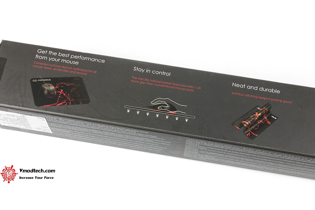ข้างกล่องจะระบุถึงคุณสมบัติหลักของมันไว้ก็คือมันจะช่วยเสริมสมรรถนะของเมาส์ของคุณจากพื้นผิวที่เป็นแบบ Control และแผ่นรองเมาส์จะไม่เลื่อนหรือเคลือนที่ง่ายๆ รวมถึงตัวเมาส์แพดนี้จะมีการให้ตัวได้ดีและคืนรูปได้ไม่ยาก
