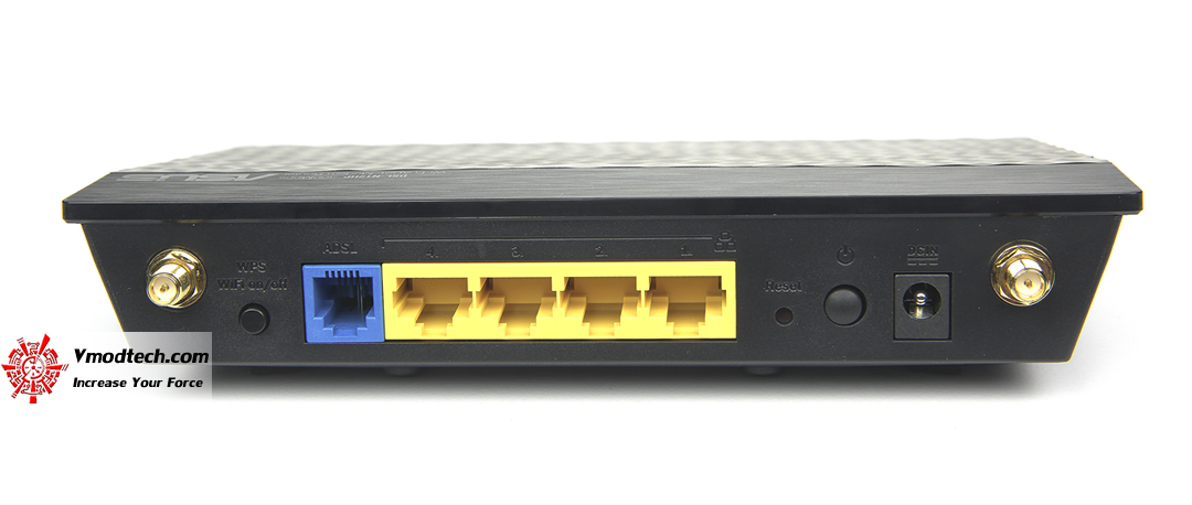 ด้าน หลังของ Router นั้นก็จะเป็นบรรดาพอร์ทเชื่อมต่อต่างๆ ซ้ายสุดจะเป็นปุ่ม WPS สำหรับเชื่อมต่อกับอุปกรณ์อื่นแบบง่าย ช่องอินเตอร์เนตเข้า ถัดมาด้านขวาที่มีแถบสีเหลืองจะเป็น Lan Port แบบ Gigabit 4 ช่อง ช่องรีเซต ปุ่มเปิด/ปิด และด้านขวาสุดจะเป็นช่องเสียบไฟจาก Adapter ขนาบข้างด้วยช่องเสียบเสาสัญญานสองต้น