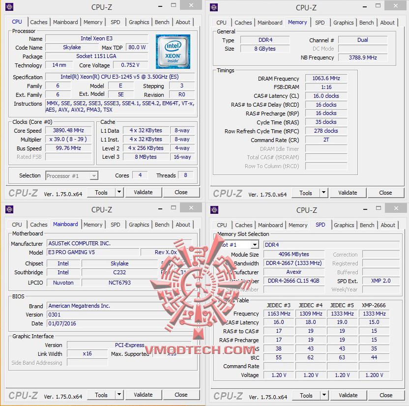 วันนี้ทดสอบกันในแบบเดิมๆครับ ที่ความเร็ว 3.9Ghz Turbo ครับ ซึ่งเป็นค่าที่วิ่งเต็มความเร็วซีพียูครับ โดยบัสแรมจะอยู่ที่ 2133Mhz ตามที่เมนบอร์ดเคลมกันเอาไว้ครับ จะสังเกตุได้ครับว่าซีพียูรุ่นนี้สเปกจะใกล้เคียงกับตัว I7 6700K ซึ่งมี 4Core 8Threads จำนวนแคสต่างๆก็เท่ากันหมด ส่วนอัตราการกินไฟ Intel Xenon E3 1245 V5 อยู่ที่ 80W ส่วน I7 6700K อยู่ที่ 95W ครับ ซึ่งถือได้ว่ากินไฟต่ำกว่าตัว I7 นั่นเองครับ