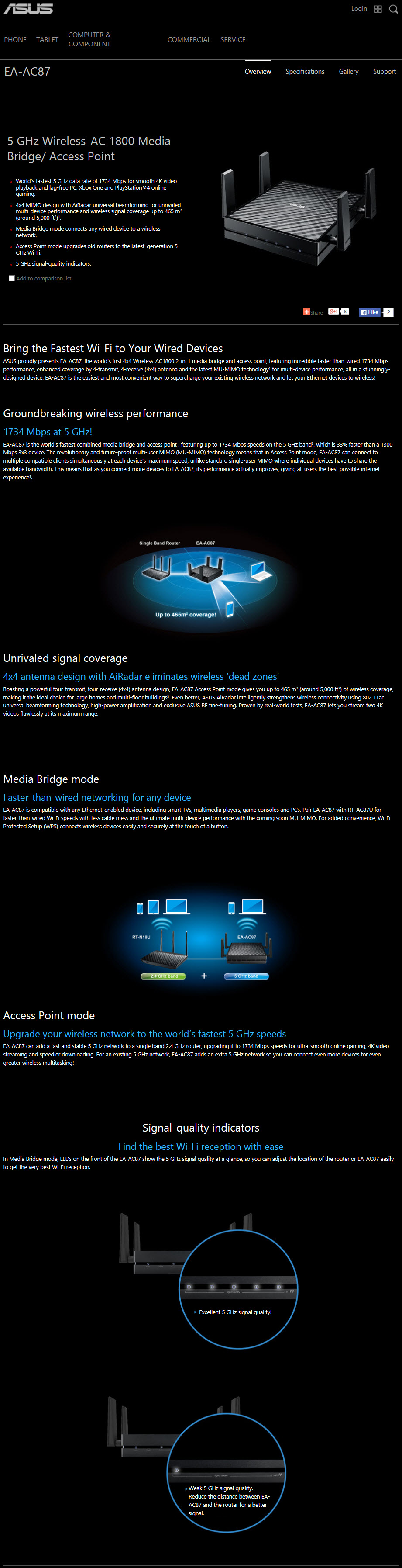สวัสดีครับ พบกับรีวิวอุปกรณ์ไร้สายความเร็วสูงกันอีกครั้งนึง ทาง ASUS นั้นเพิ่งเปิดตัวอุปกรณ์รุ่นใหม่ซึ่งมันเป็น Media Bridge และ Access Point ในตัวเดียวที่ทำงานบนย่านความถี่ 5 GHz ในคลาส AC 1800 ครับ ชื่อรุ่นว่า EA-AC87 ซึ่งเป็นอุปกรณ์ที่จะช่วยขยายพื้นที่ไร้สายในวงที่กว้างขึ้นและมีความเร็วในการรับส่งข้อมูลมากขึ้นด้วย เรามาชมรายละเอียดกันเลยครับ