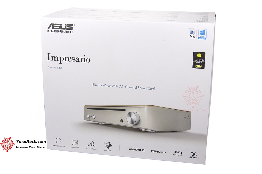 กล่องบรรจุนั้นออกแบบสบายๆด้วยโทนสีขาวอุ่นๆ คุณสมบัติหลักๆของตัว ASUS Impresario SBW-S1 PRO นั้นได้มีแสดงไว้บนกล่องเพื่อให้เลือกหาไม่ผิดวัตถุประสงค์การใช้งาน