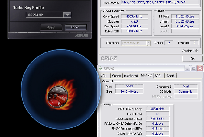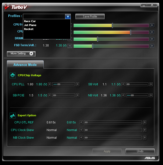 ในส่วนของโปรแกรม turboV นี้ก็สามารถช่วยให้เราสามารถทำการโอเวอร์คลอคระบบลากFSBและเพิ่มไฟเลี้ยงได้จากในวินโดเลย โดยดีฟอลท์ของโปรแกรมที่ให้มาจะมีค่าความเร็วมาให้3แบบดังรูปซึ่งค่าทั้งหมดนั้นก็สามารถเพิ่มความเร็วได้อย่างมีสเถียรภาพจากความเร็วเดิมของซีพียูนั้นๆ แต่ถ้าต้องการมากกว่านั้นก็สามารถเซทอัพและตั้งโปรไฟล์เป็นของตัวเองได้เช่นจะให้ค่าดีฟอลท์ของเราเองได้ด้วยสำหรับเอาไว้ใช้งานกับ Turbo Key แต่จากที่ทดลองใช้ไม่สามารถโอเวอร์คลอคแบบก้าวกระโดดเช่นบัส333เดิมไปเป็นบัส500ได้เลยภายในครั้งเดียวนะครับ ซึ่งก็เป็นปกติทั่วไปสำหรับโปรแกรมเพิ่มความเร็วในวินโดอยู่แล้ว