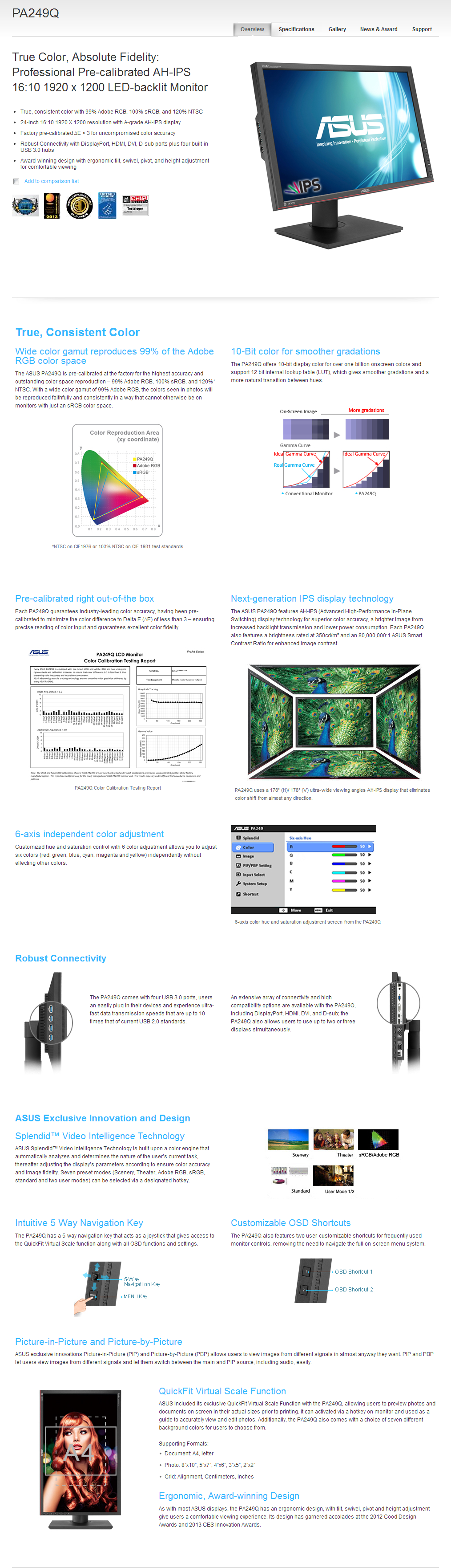 ..........สวัสดีครับวันนี้มาพบ Monitor คุณภาพยอดเยี่ยมจาก ASUS กันบ้างดีกว่าครับกับ ASUS ProArt Series LED Monitor PA249Q ซึ่ง Monitor รุ่นนี้ผมได้ลองสัมผ้สในงาน Computex 2013 เมื่อต้นปี่ที่ผ่านก็รู้สึกถูกใจเป็นอย่างมาก วันนี้ได้ลองเล่น ลองทดสอบเองบอกได้คำเดียวว่ามันสุดยอดมากๆครับ ใครที่ทำงานด้านการถ่ายภาพ ตกแต่งภาพ ทำงานด้านกราฟิกดีไซน์ กำลังมองหาจอภาพคุณภาพสูงขนาดพอเหมาะ Asus PA249Q นี้คือคำตอบครับ ก่อนอื่นไปชมรายละเอียดจากผู้ผลิตก่อนเลยดีกว่าครับ