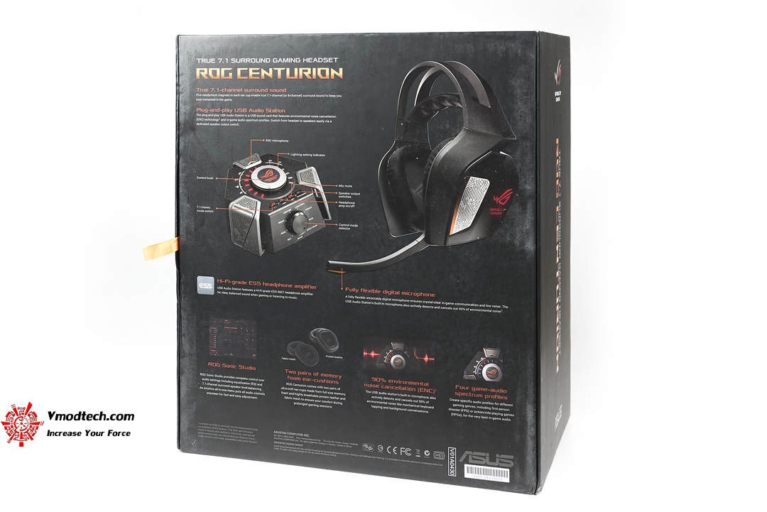 กล่องบรรจุตัว ASUS ROG CENTURION True 7.1 Surround นั้นได้รับการออกแบบมาให้สวยงาม โลโก้ ROG นั้นก็เด่นมาก ตัวกล่องมีขนาดใหญ่ น้ำหนักไม่มากนักครับ ด้านหน้าและด้านหลังมีอธิบายคุณสมบัติต่างๆไว้ให้พิจารณาการทำงานได้อย่างชัดเจน