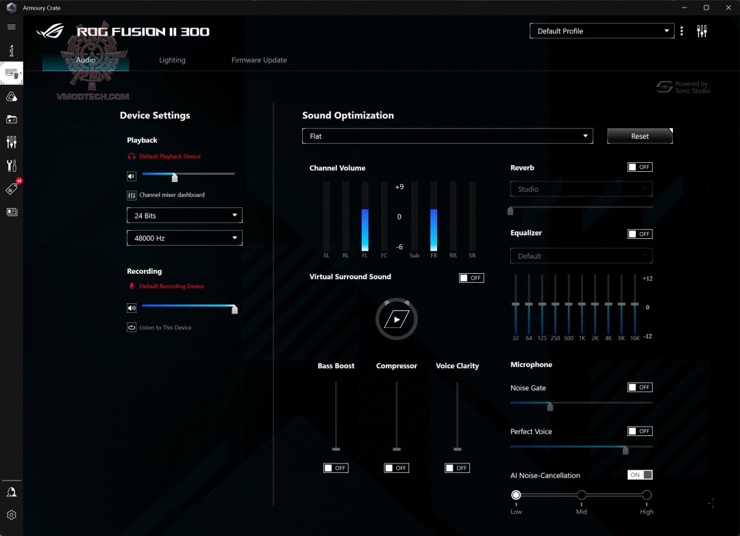 สำหรับเสียงของ ROG Fusion II 300 นั้นจะสามารถตอบสนองเสียงความถี่ที่ 20 Hz - 40,000 Hz เสียงจะมีลักษณะกลางๆไม่เด่นที่ย่านใดย่านนึง เสียงต่ำครบ เบสไม่ท่วม เสียงกลางต่ำที่มีแรงปะทะเมื่อเล่นเกมส์ ซึ่งแระปะทะที่ว่านี้ไม่ได้หนักหน่วงรุนแรง คือพอดีพอดี เสียงแหลมนั้นผมฟังว่ามีรายละเอียดพอประมาณครับไม่คมไม่กัดหู