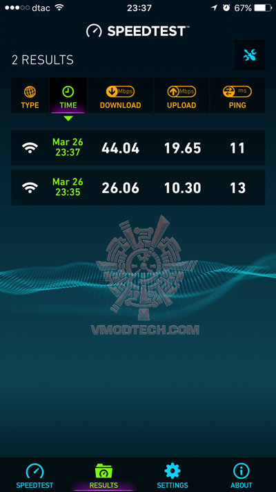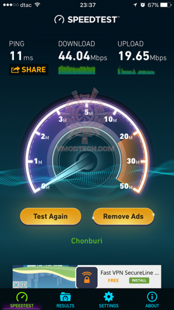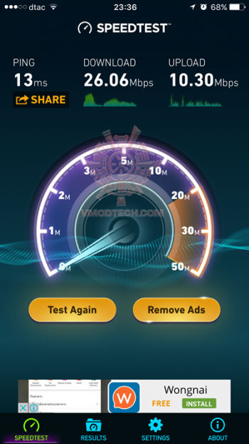ที่ระยะประมาณ 15 เมตร และมีผนังกั้นอยู่สามชั้นซึ่งเป็นจุดอับสัญญาณภายในบ้าน ผมได้ย้าย RP-AC53 ไว้ที่ตรงกลางระหว่างจุดเทสกับ Router และทำการทดสอบ ผลคือ การต่อเชื่อมผ่าน Repeater RP-AC53 นั้นยังให้ค่าความเร็วที่เหมือนเดิม ปิงเท่าเดิมแต่เมื่อย้ัายโทรศัพท์ไปเกาะกับ Router หลักนั้น ความเร็วที่ได้ตกลงอย่างน่าใจหายครับ
