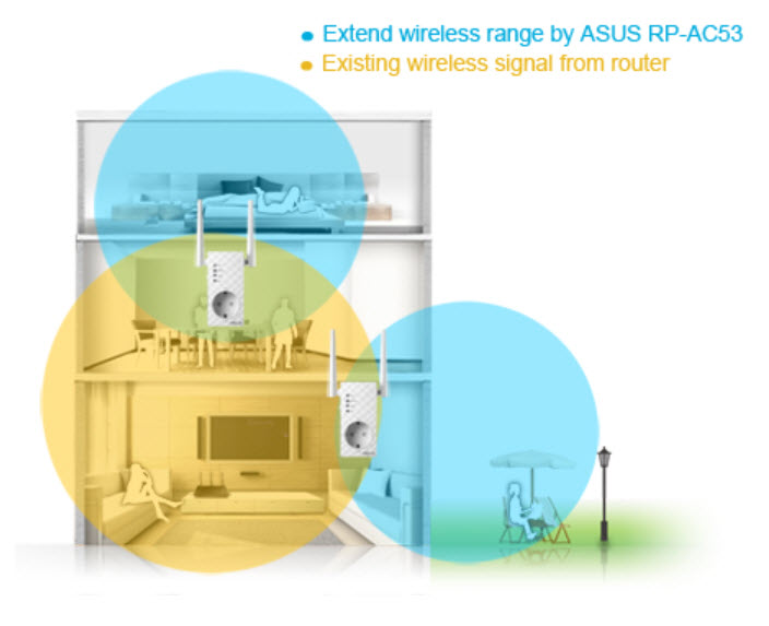ในรูปด้านบนนั้น บริเวณวงกลมสีเหลืองคือบริเวณขอบเขตของการกระจายสัญญาณจาก Router หลักในบ้านสามารถครอบคลุมถึง จะสังเกตุได้ครับว่า ถ้าเราอยู่นอกบ้านหรือชั้นสอง สัญญาณจะไปไม่ถึงใช่มั๊ยครับ ก็ให้เรานำตัว RP-AC53 นั้นไปวางไว้ในขอบๆของบริเวณที่ Router จะกระจายสัญญาณไปถึงเพื่อเพื่มพื้นที่ให้ครอบคลุมมากขึ้น