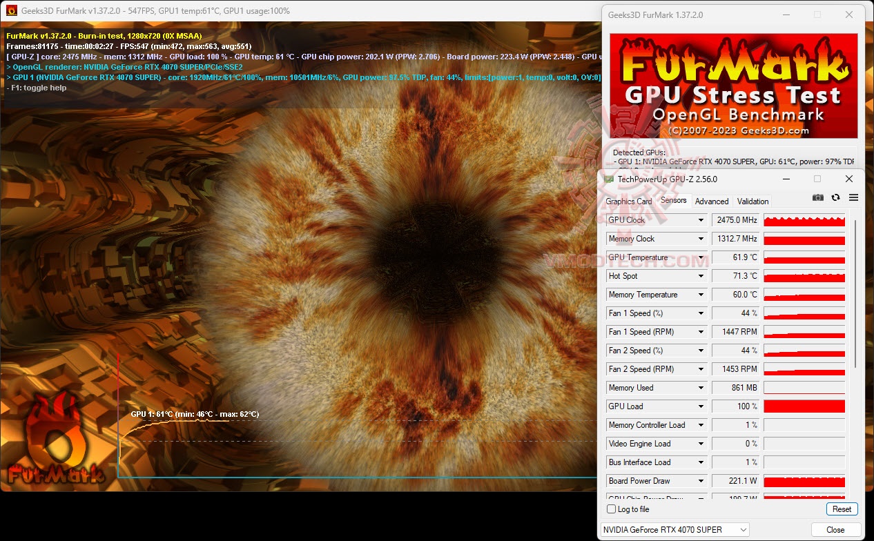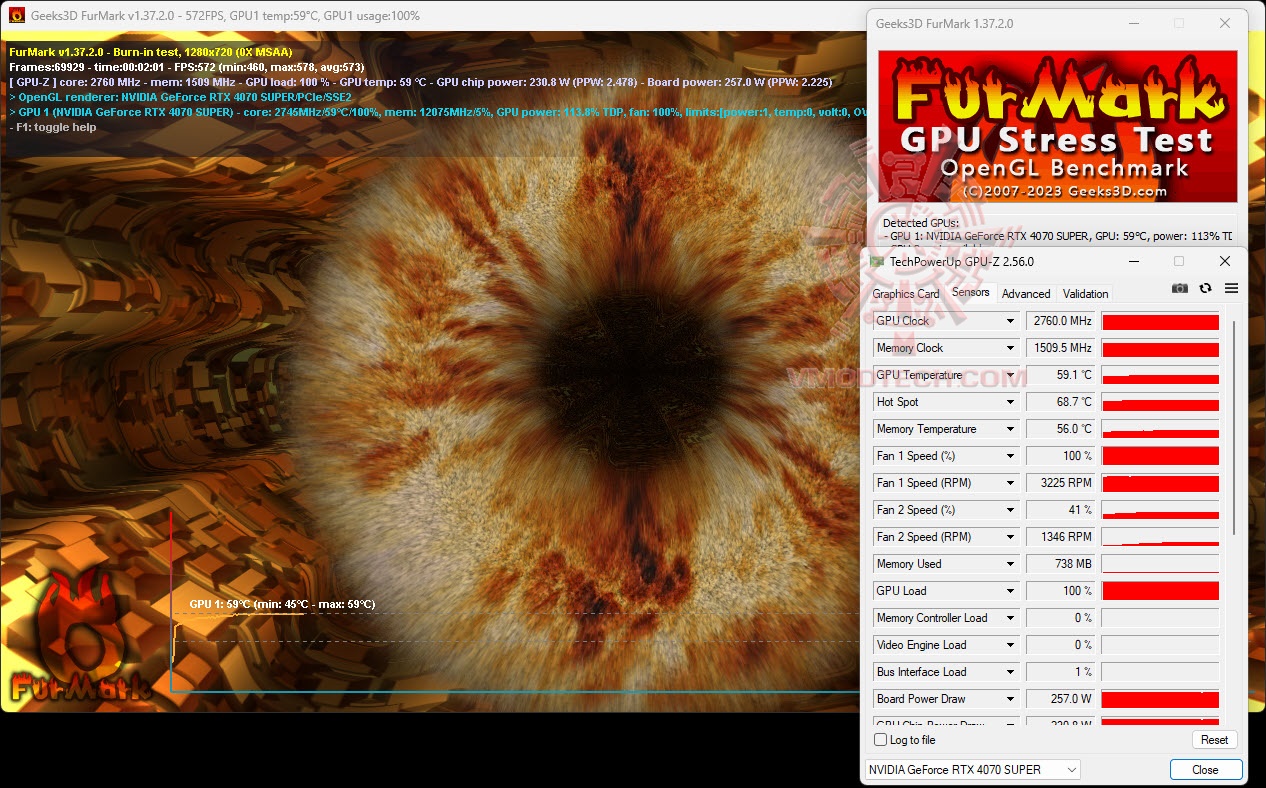 ความร้อนนั้นสูงสุดอยู่ที่ไม่เกิน 63 องศาเซลเซียสนอกเคสโดยที่รอบพัดลมทำงานตามโพรไฟล์ของการ์ด เสียงพัดลมจะเงียบสนิท