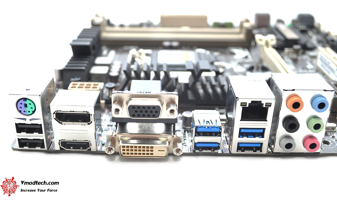 ช่อง เชื่อมต่อ อุปกรณ์ด้านหลังประกอบด้วย 1 x PS/2 keyboard/mouse port , 1 x D-Sub port , 1 x DVI-D port , 1 x HDMI port , 2 x USB 3.0/2.0 ports , 3 x USB 2.0/1.1 ports , 1 x RJ-45 port , 1 x optical S/PDIF Out connector , 5 x audio jacks
