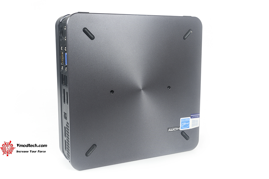 ที่ด้านใต้ของตัวถังจะมียางรองกันลื่นสี่จุด และก็จะมีรูสำหรับยึดแบร๊คเก็ตสำหรับนำตัว VivoMini VC65C1 ไปติดตั้งเข้ากับหลังจอมอนิเตอร์ได้ด้วยผ่านทาง VESA mount
