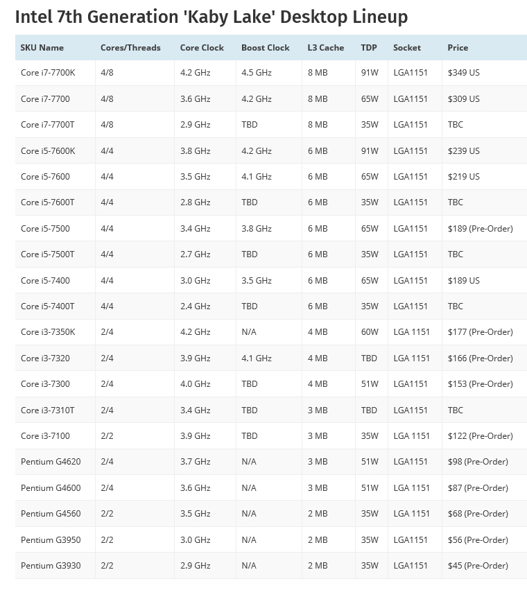 ในเจนเนอร์เรชั่นที่7 นั้นก็จะมีซีพียูอยู่ด้วยกัน 3รุ่นที่จะทำการเปิดตัวทยอยกันออกมาเรื่อยๆครับได้แก่ Intel Core i7 มีจำนวน 4cores / 8hyper-threads / Up to 8 MB L3 cache , Intel Core i5 มีจำนวน 4cores / NO hyper-threading / Up to 6 MB L3 cache , Intel Core i3 มีจำนวน 2cores (TBA) ครับ ในส่วนของแรมก็รองรับแรม DDR4 บัส 2133Mhz เหมือนเช่นเคยครับ
