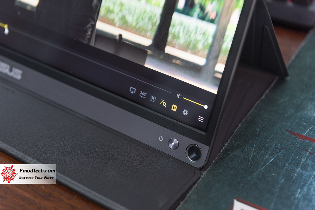 ที่มุมด้านล่างขวาของตัว ZenScreen MB16AP นั้นจะมีช่องสำหรับเสียบปากกาเพื่อตั้งจอในแนว Portrait ครับ ส่วนปุ่มกลมๆนั้นจะเป็นปุ่มเปิด/ปิดจอ
