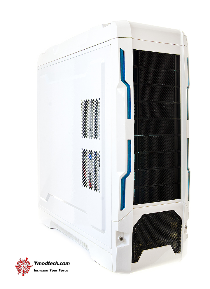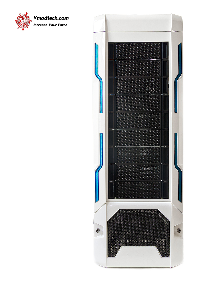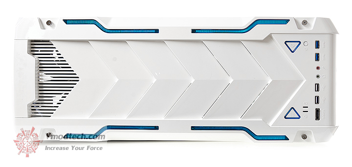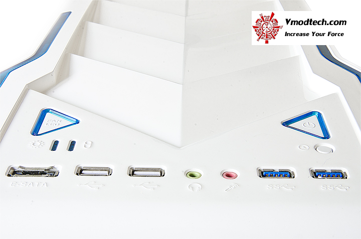 Front Panel โดดมาอยู่ด้านบนส่วนหน้าครับ มากันครบๆ ทั้ง Power Switch, Reset Switch, USB 2.0, USB 3.0, E-SATA, Mic, Audio  และปุ่มไฟ LED ของตัวเคส แล้วแต่ชอบเลยครับ ใครชอบ เคสไฟวิ๊บๆ หรือใครชอบเคสดุดันแรงในตัวเอง เลือกได้ตามสะดวกครับ