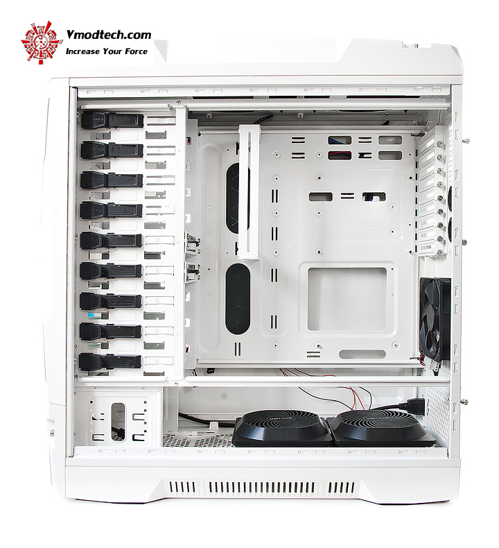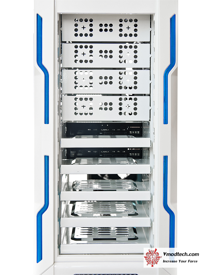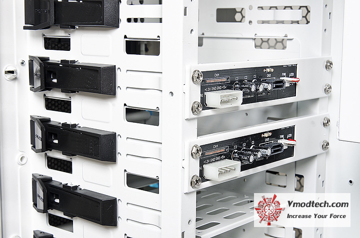 Drive Bays 5.25"  มี 9 ช่องครับ ถอดฝาดำออกเปลือยให้ดูกันจะๆ ด้านบน 4 ช่องเป็น Drive Bays 5.25" ธรรมดาครับ ด้านล่าง 5 ช่องเป็น Drive Bays 5.25" แบบมีแผ่นไสลด์ ดึงออกมาใส่ ฮาร์ดดิสขนาดต่างๆตามสะดวกครับ เป็นแบบ External 2 ช่องครับนับจากล่างขึ้นบนก็คือช่องที่ 4 และ ช่องที่ 5
