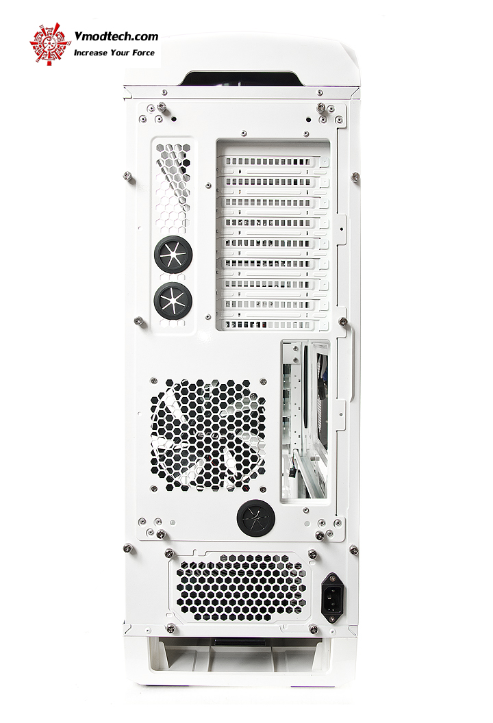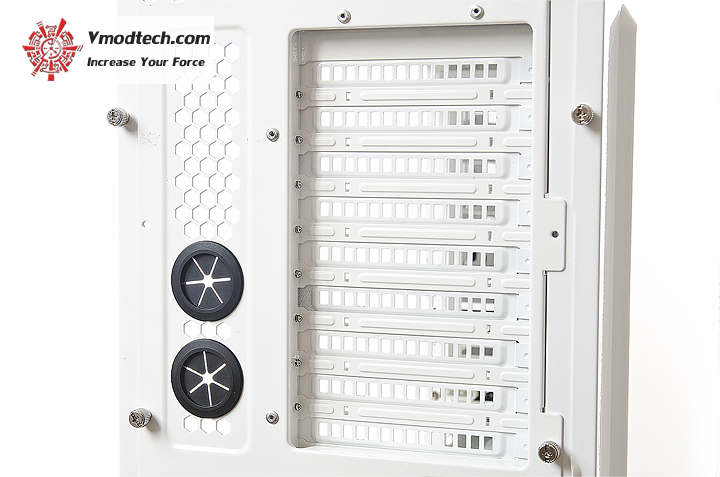 โคสอัพมาดูด้านหลังก่อนครับ Expansion Slots หรือฝาปิดสล็อต PCI นับได้ 9  ฝา ครับ และ ดำๆกลมๆตรงนั้นไม่บอกก็รู้ว่า รองรับระบบระบายความร้อนด้วนน้ำอย่างเต็มรูปแบบครับ