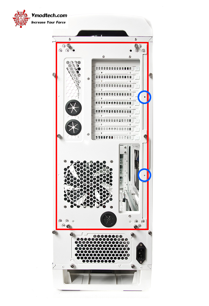 ลูกเล่นแปลกพิสดารที่เคสตัวนี้มีมาให้ครับ ถ้าเราถอดสกรู 6 ตัวภายเส้นสีแดงที่ผมขีดไว้ให้ แล้วเอา มือจับแผ่นลองมาเธอบอร์ด มาติดตั้งไว้โดยขันสกรูเข้า ไปตรงรูที่ผมวงไว้สีน้ำเงินตรงนั้น จะสามรถดึง มาเธอบอร์ด ออกมาได้ทั้งแผงเลยครับ ง่ายๆเลย แล้วเราพลิกกลับด้านโดยหมุนตามเข็นนาฬิกา 180 องศายัดเข้าไปใหม่ ลักษณะของเคสก็จะอยู่ในปกติทั่วๆไปครับ ไม่ตีลังกาขาชี้ฟ้าอีกแล้ว!!!!!