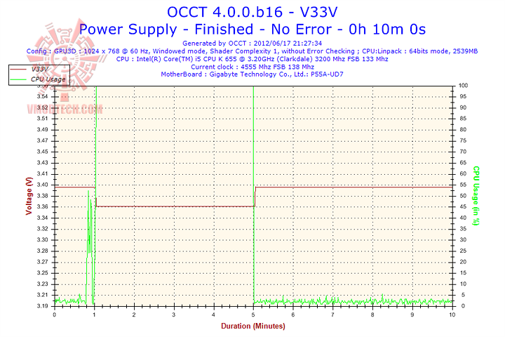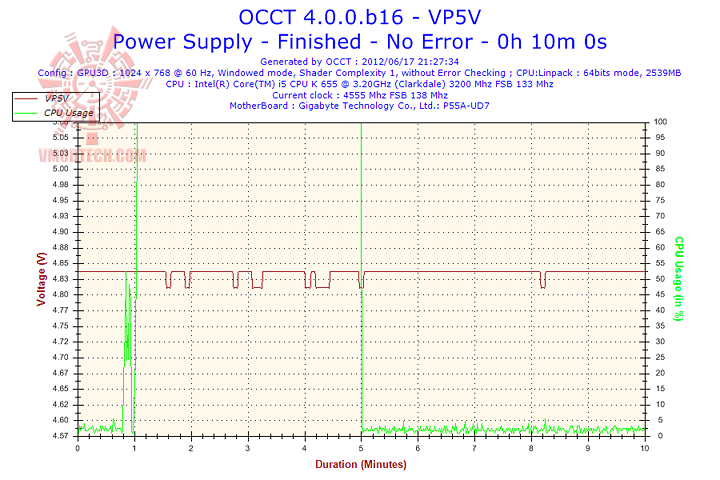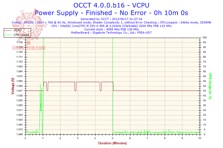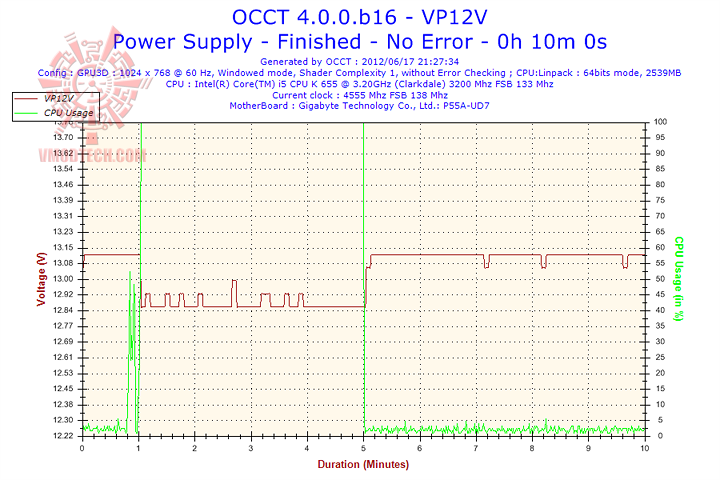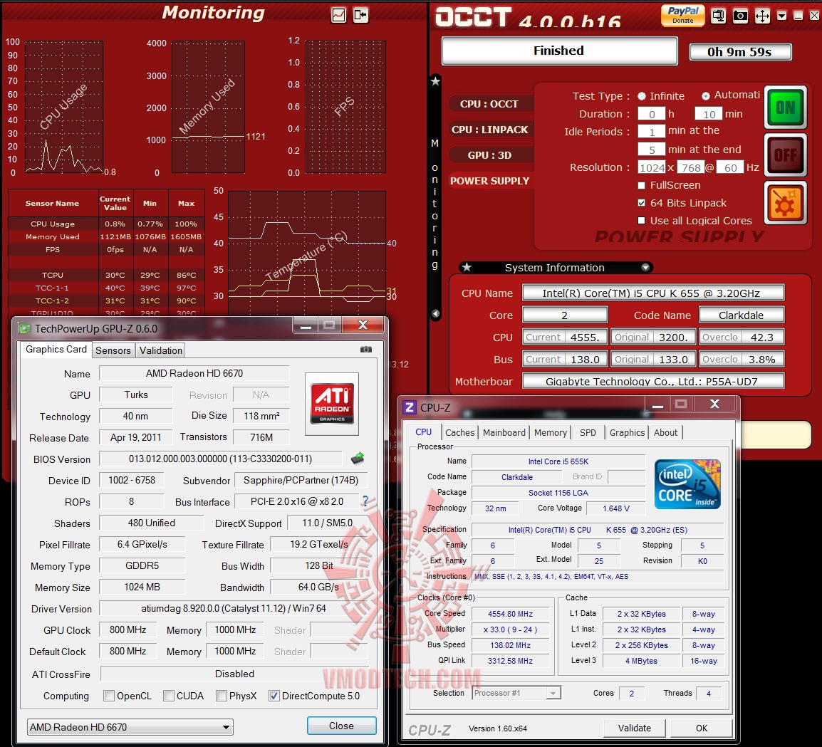 จัดชุดเทสด้วย i5 655K ที่Overclock ไปที่ประมาณ 4.55 GHz ด้วยไฟ CPU ที่มากกว่าปกติสาม-สี่เคาะตอนที่ตั้งใน Bios เพื่อให้ระบบดึงไฟจาก PSU มากกว่าปกติ แต่วันนี้จะเป็นการ์ดจอขนาดเล็กอย่าง AMD HD6670 ครับเพื่อให้เหมาะสมกับ PSU ที่ทำการทดสอบในวันนี้
