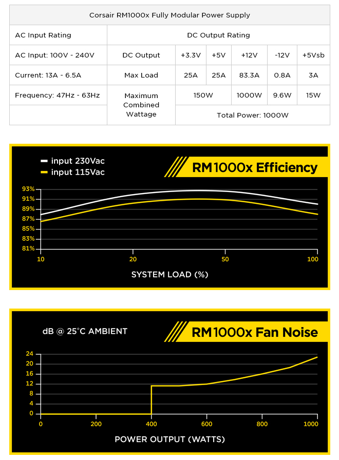 สเปคการทำงานคร่าวๆ จะเห็นได้ว่า Corsair RMx RM1000x 1000 Watt 80 PLUS Gold นั้นมีค่า Efficiency สูงมากๆครับอยู่ที่ 91-93เปอร์เซ็นกันเลยทีเดียว ในส่วนของเสียงรบกวนด้วยเทคโนโลยี Zero RPM Fan Mode ที่พัดลมของ PSU จะทำงานตามที่โหลดของตัว PSU ทำงานหรือในสถานะไม่โหลดมากพัดลมก็จะไม่หมุนเลยครับเป็นการประหยัดพลังงานรวมไปถึงเสียงรบกวนที่น้อยมากอีกด้วย ซึ่งในกราฟโหลดสูงสุดที่ 1000W เสียงพัดลมอยู่แค่ 23dB เท่านั้นเองครับ เงียบมากๆ