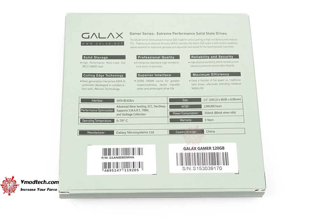 กล่องของ GALAX GAMER SSD 120GB นั้นมีพื้นสีดำ ตัดกับสีเขียวทึมๆ ตัว SSD นั้นมีการเชื่อมต่อแบบ SATA 6Gb/s หรือ SATA-3 ครับและมีขนาด 2.5 นิ้ว หนา 6.9 มิลลิเมตร