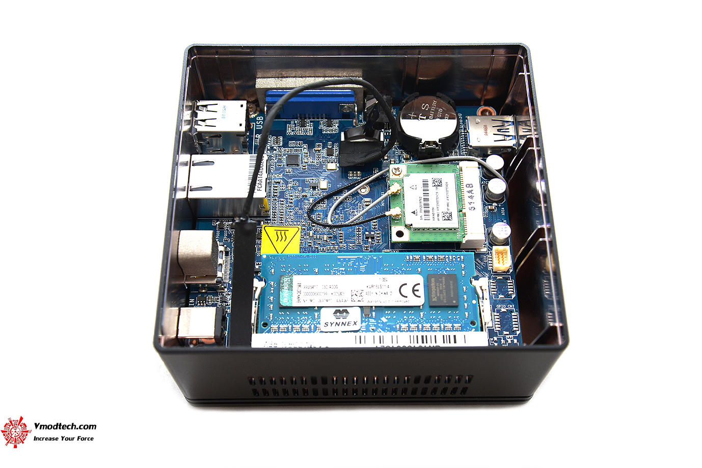 ภายในจะมีช่องสล๊อตแรม 1ช่องเป็น DDR3L 1.35v ช่อง 1 x Half-size mini-PCIe slot occupied by the WiFi+BT card รวมทั้งยังมีช่องต่อ Supports 2.5” thickness 7.0/9.5mm Hard Drives (1 x 3Gbps SATA2) ที่รองรับพวกฮาดดิสก์ขนาด 2.5" หรือพวก SSD มาติดตั้งลงไปได้ครับ