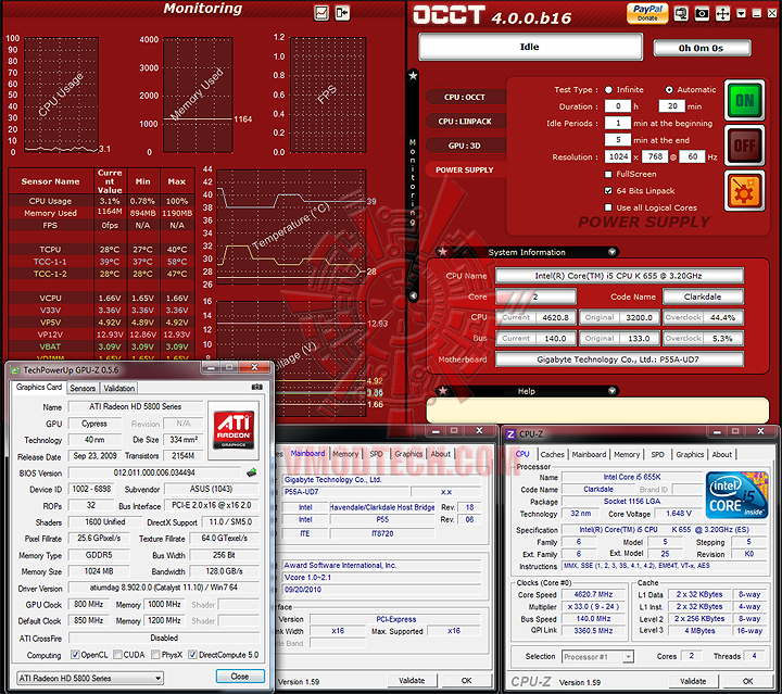 จัดชุดเทสด้วย i5 655K กับ HIS HD5870 กันครับ โดยที่ CPU จะมีการ Overclock ไปที่ประมาณ 4.6 GHz ด้วยไฟ CPU ที่มากกว่าปกติสาม-สี่เคาะตอนที่ตั้งใน Bios เพื่อให้ระบบดึงไฟจาก PSU มากกว่าปกติ รวมถึงตั้งเป็นมาตรฐานสำหรับเทส Heat Sink ไปด้วยในตัวครับ