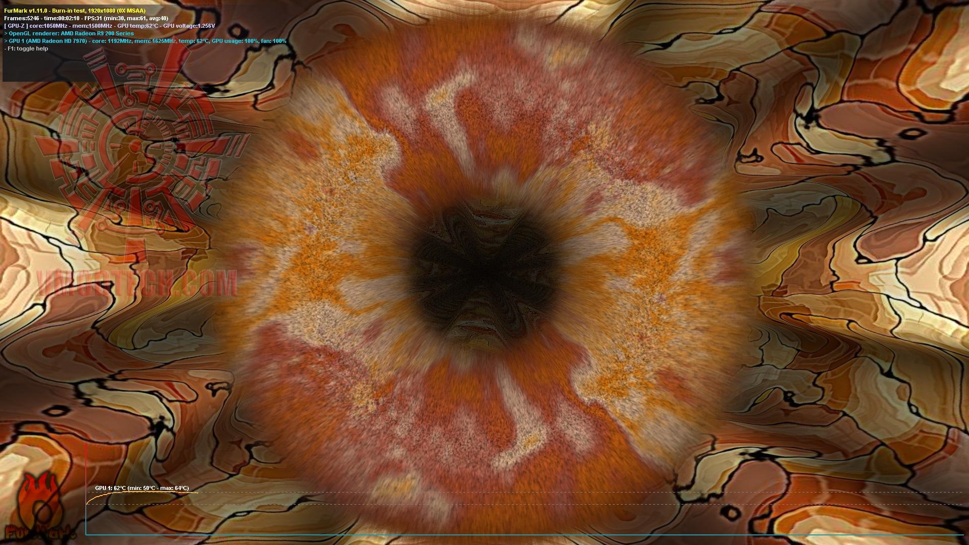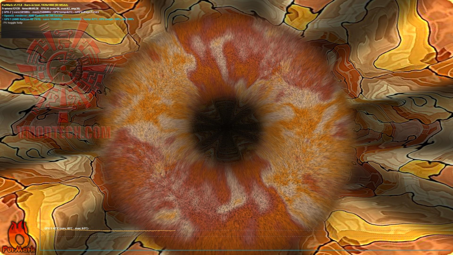 อุณหภูมิของการ์ดขณะ Furmark นั้นจะอยู่ที่ไม่เกิน 64 องศา รอบพัดลมออโต้แต่สภาวะโหลดแบบนี้ก็จะวิ่งไปที่ 100 เปอร์เซนต์ สุดยอดจริงๆ WINDFORCE 3X