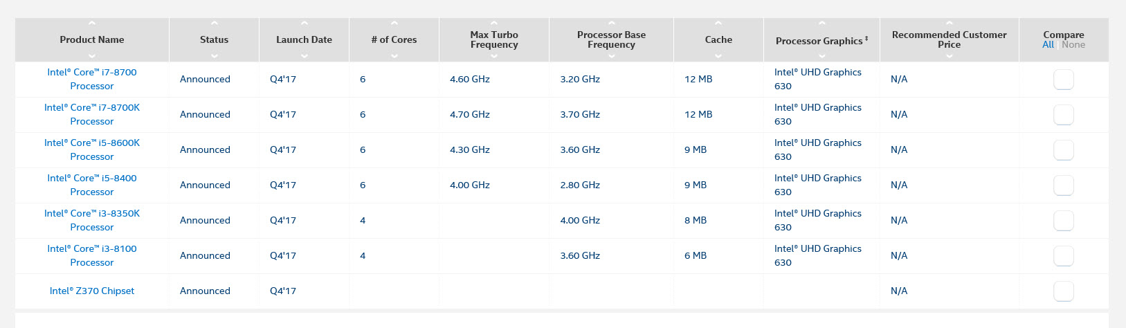 รุ่นต่างๆ Intel 8th Gen "Coffee Lake" ที่ทำการเปิดตัวในเดือนตุลาคม 2017 นี้ครับ