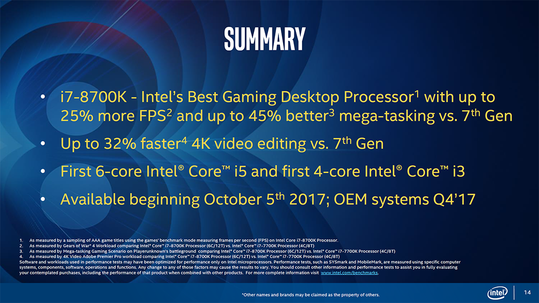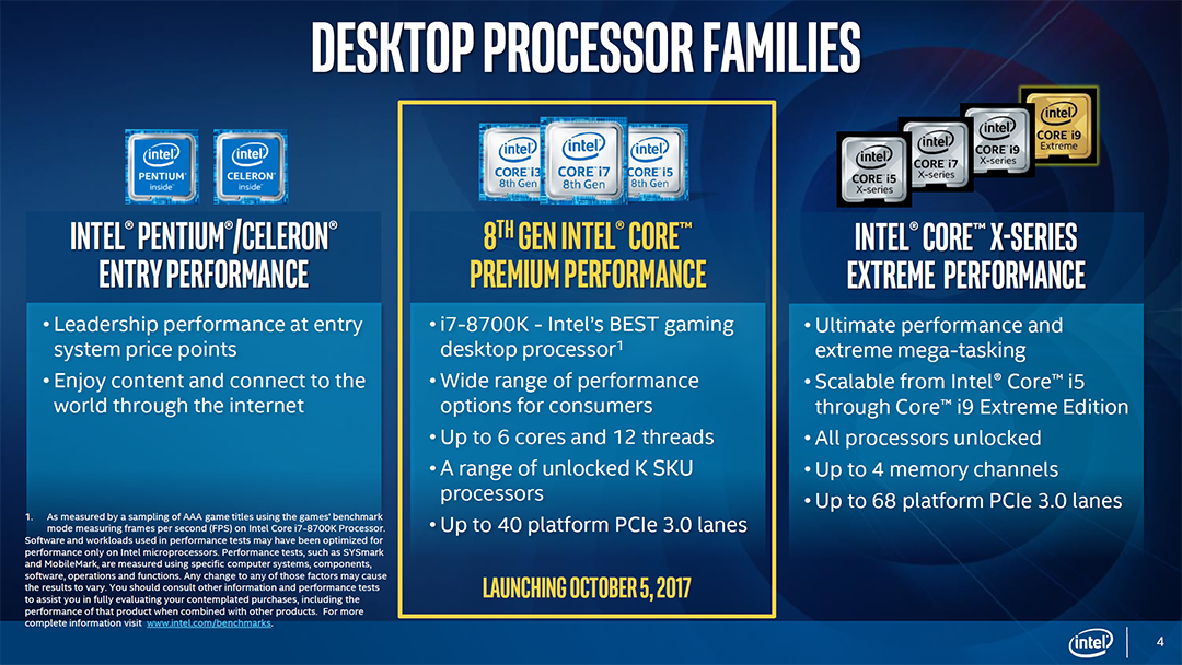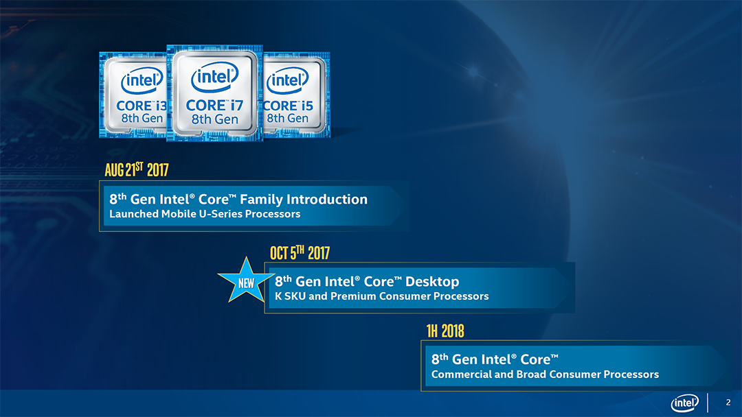 เปิดตัวในเดือนตุลาคมนี้ในรุ่นใหญ่สุดก็คือ Intel Core i7 8700K ออกแบบมาสำหรับคอเกมส์มิ่ง นักโอเวอร์คล๊อก และผู้ใช้งานทั่วไปเน้นการออกแบบ