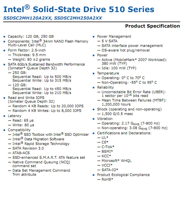 มาดูในรายละเอียดบ้างครับ สำหรับ Intel SSD 510 Series นั้น จะใช้ NAND Flash Memory ขนาด 32 nm หรือ 32 นาโนเมตร เชื่อมต่อด้วย Interface SATA 6 Gb/s นั่นเองครับ ขนาดความจุที่มีวางจำหน่ายก็มีสองขนาดอย่างที่ได้กล่าวไปแล้วย่อหน้าบน ก็เรียกได้ว่ามีขนาดมากพอสมควรแล้วละครับแม้ว่าจะดูน้อยๆไปบ้างสำหรับการใช้งานในชีวิตประจำวันก็ตาม เดี๋ยวเราลองเข้าไปชมรายละเอียดต่างๆจากหน้าเว็บของ Intel อีกครั้งจาก Link ด้านล่างครั้บ