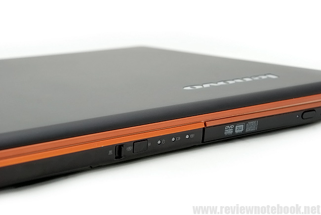 ด้านหน้ามีสวิชเปิดปิดระบบ wireless ไฟสถานะต่างๆ และไดร์ฟ DVD RW แบบถาด