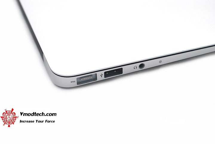 ด้านซ้ายของตัว MacBook Air ครับ จะมีเบ้าสำหรับเสียบสายไฟจากภายนอก ถัดไปจะเป็น USB 2.0 และสุดท้ายจะเป็นช่องเสียบหูฟัง ใกล้ๆกันจะเป็นรูของลำโพงนะครับที่เห็นเล็กๆด้านขวาสุด