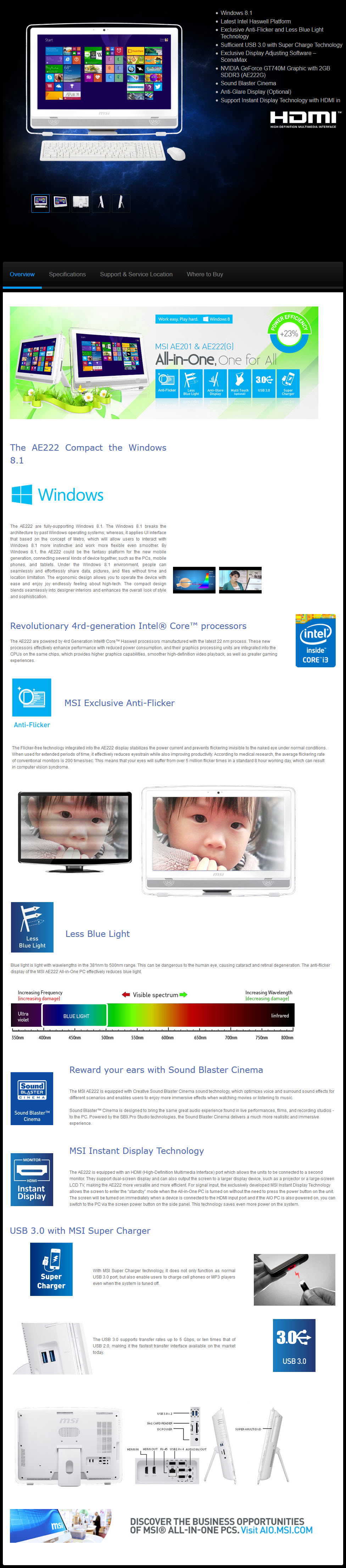 ..........สวัสดีครับ วันนี้มาพบกับ ALL-IN-ONE PC จาก MSI กันครับ ในรุ่น MSI Entertainment Series AE222 ALL-IN-ONE PC หน้าตาสวยงามโทนขาวสะอาดตาครับ ฟังก์ชั่นเด่นก็มี Exclusive Anti-Flicker and Less Blue Light Technology ช่วยรักษาสายตา แล้วก็ USB 3.0 with MSI Super Charge Technology เป็นต้นนะครับ ว่าแล้วก็ลุยเลยดีกว่า แต่ก่อนอื่น ไปชมรายละเอียดจากผู้ผลิตก่อนครับ