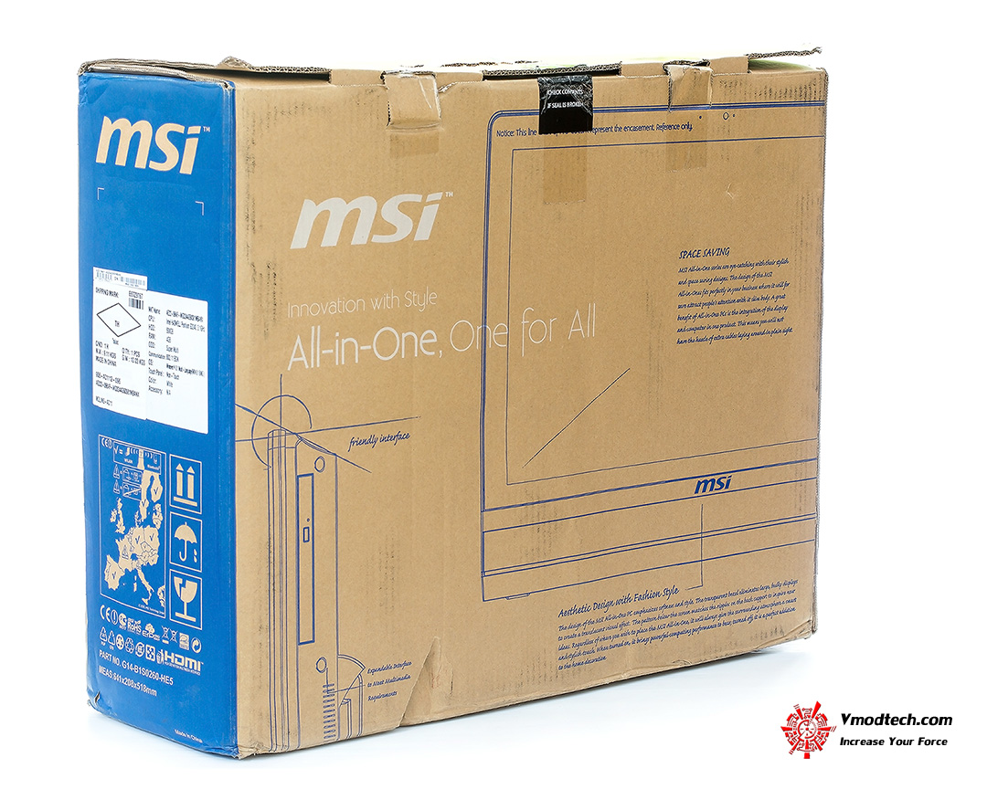 MSI AE222 ALL-IN-ONE PC บรรจุอยู่ในกล่องลูกฟูกสีน้ำตาลพิมพ์ลายสีฟ้าครับ