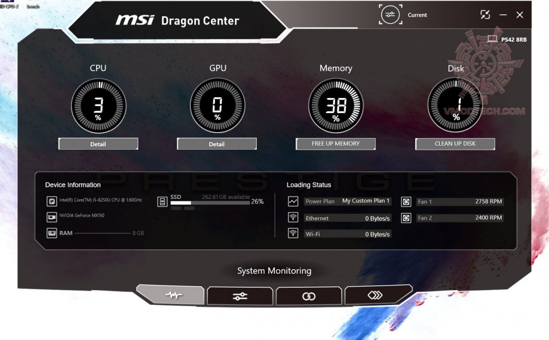 ตัว Software MSI Dragon Center ที่สามารถตรวจสอบรายละเอียดต่างๆของอุปกรณ์ภายใน และสามารถปรับแต่งรอบพัดลม การทำงานของ CPU ในโหมดต่างๆ สะดวกมากๆครับ