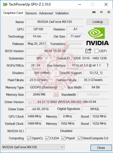 กราฟฟิกการ์ดนั้นติดตั้ง NVIDIA GeForce MX150 2GB GDDR5 มาให้ มันมีแรมมาให้ตัว 2 กิ๊กกะไบท์แบบ GDDR5 ครับ