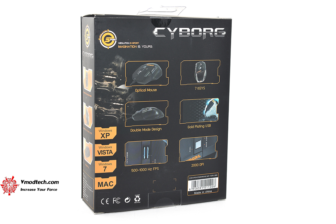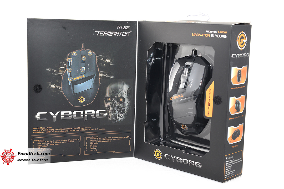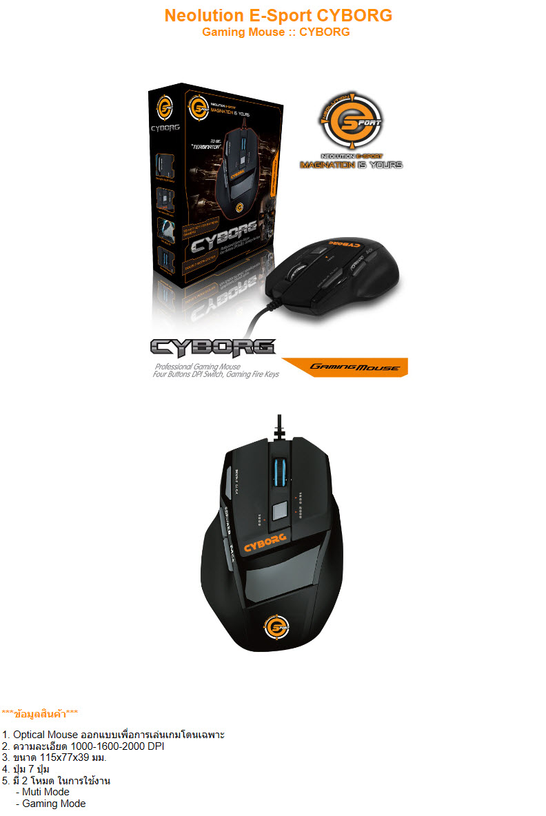 หน้าตาเต็มๆของตัวเมาส์ Neolution E-Sport CYBORG ครับ ตัว CYBORG นั้นเป็น Optical ที่มีความละเอียดสูงสุด 2000 dpi ครับ