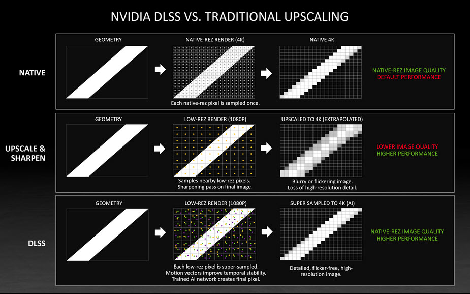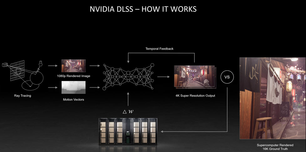 NVIDIA DLSS เป็นอัลกอริธึม AI ความละเอียดสูงที่ประมวลโดย Tensor Cores บน GeForce RTX GPUs ความละเอียดระดับสูงสุดนั้นคือกระบวนการคาดการณ์เอาต์พุตที่มีความละเอียดสูงกว่า (เช่น 4K) อย่างแม่นยำจากอินพุตที่มีความละเอียดต่ำกว่า (เช่น 1080p) ช่วยให้เกมแสดงผลที่ 1080p ปรับปรุงอัตราเฟรม จากนั้นใช้ AI และข้อมูลเอ็นจิ้นเกมเพื่ออัพคุณภาพของภาพเอาต์พุตแบบ 4K