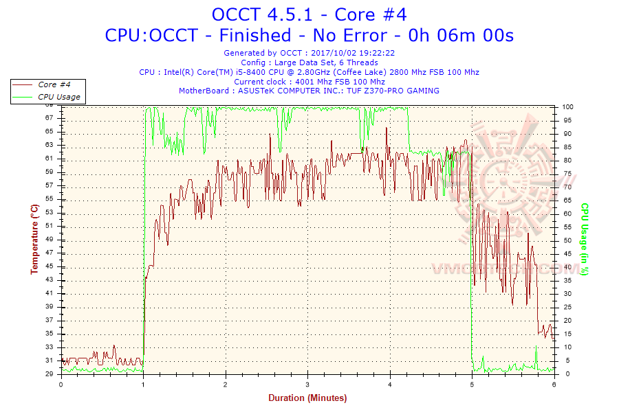 ทดสอบในดปรแกรม OCCT 4.5.1 เป็นเวลา 5 นาที ความร้อนสูงสุดอยู่เพียงแค่ 68 องศาฯ เท่านั้นเองครับ ส่วนไอเดินอยู่ที่ 36 องศาฯเท่านั้น เย็นมากๆกับกับฮีตซิงค์บางๆพัดลมใบเดียวการรันแบบเต็มระบบ 100เปอร์เซ็นต์ของซีพียู ถ้าเสริมพัดลมเข้าไปอีกฝั่งน่าจะเย็นเฉียบน้องๆชุดน้ำเลยครับ
