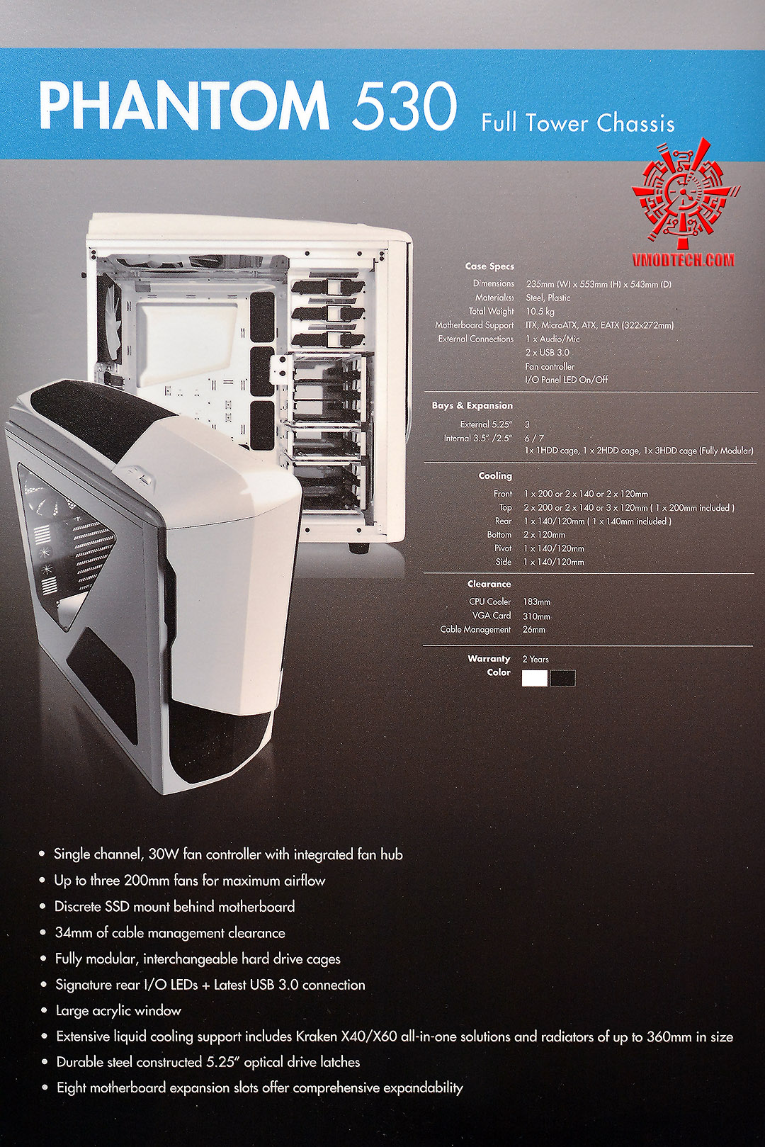 ...วันนี้เราจะพามาชมบูธ NZXT กันนะครับ ซึ่งหลายๆท่านถ้าสนใจผลิตภัณฑ์ของแบรนด์นี้ก็ติดตามหาซื้อกันได้ที่ร้าน TKCOM ในประเทศไทยนะครับ ซึ่งทาง TKCOM ก็จะเป็นผู้จัดจำหน่ายโดยตรงในประเทศไทยกันเลยนะครับ โดยในงานนี้ก็ได้มีผลิตภัณฑ์ใหม่มาแนะนำกันหลายรุ่น เริ่มกันด้วย NZXT PHANTOM 530 กันก่อนเลยนะครับ และก่อนอื่นก็ไปชมสเป็คต่างๆของเคสรุ่นนี้กันก่อนครับ