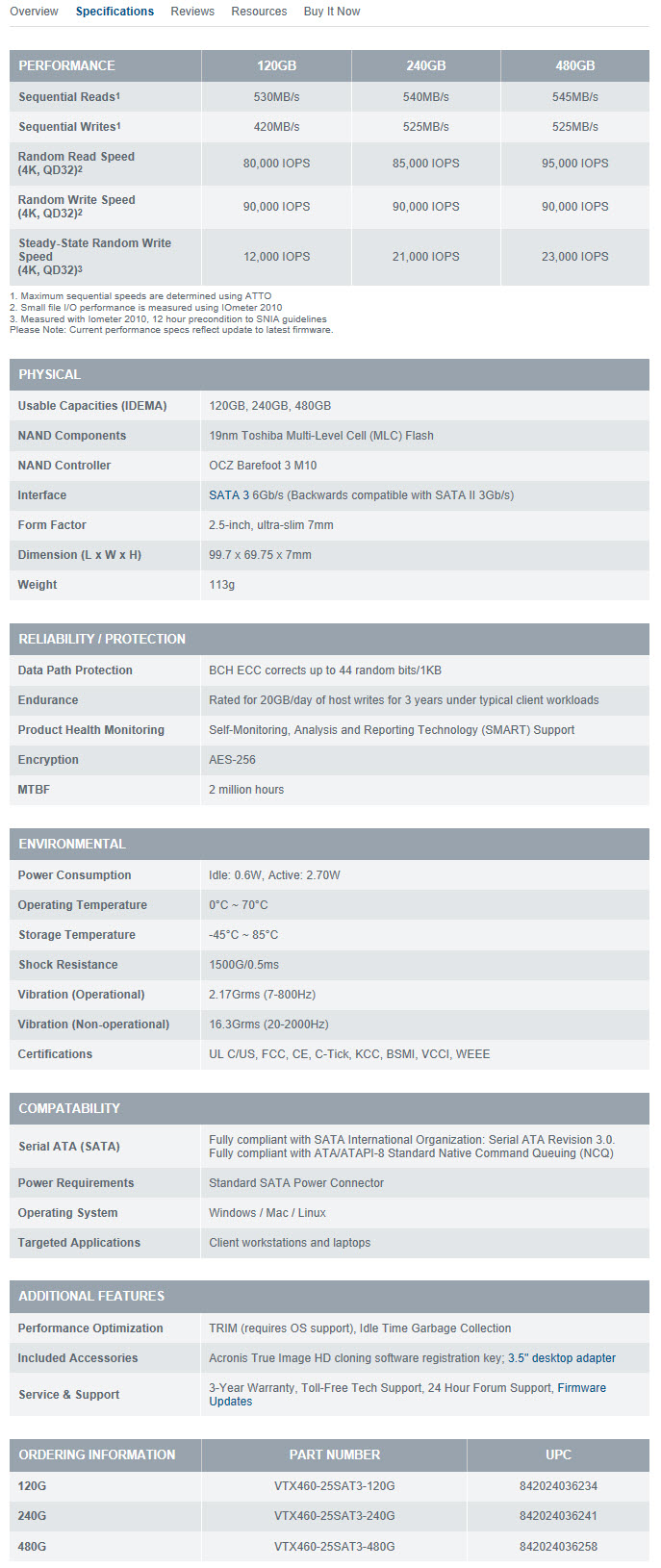 ตามสเป็กของ OCZ Vertex 460 240GB นั้น การเชื่อมต่อนั้นก็เป็น SATA 6Gb/s หรือ SATA-3 ครับและมีขนาด 2.5 นิ้ว ใช้ NAND MLC Flash ขนาด 19nm ของ Toshiba แบบ Multi Level Cell และใช้คอนโทรลเลอร์ OCZ Barefoot 3 M10 ในการควบคุม SSD ครับ