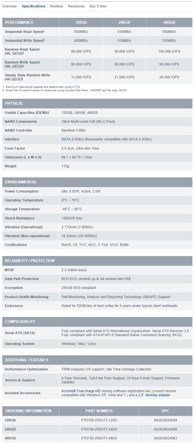 ตามสเป็กของ OCZ Vextor 150 240GB นั้น การเชื่อมต่อนั้นก็เป็น SATA 6Gb/s หรือ SATA-3 ครับและมีขนาด 2.5 นิ้ว ใช้ NAND MLC Flash ขนาด 19nm แบบ Multi Level Cell และใช้คอนโทรลเลอร์ OCZ Indilinx Barefoot 3 M00 ในการควบคุม SSD ครับ