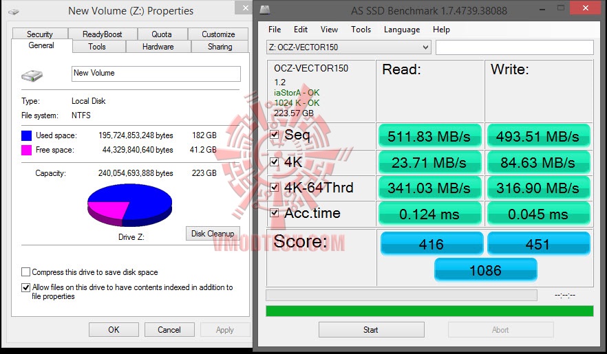 ประสิทธิภาพและสมรรถนะของ OCZ Vextor 150 240GB นั้นอยู่ในเกณฑ์ที่น่าสนใจครับกับความเร็วในการอ่าน/เขียนในระดับห้าร้อยเมกกาไบท์ต่อวินาที และเมื่อลองใส่ข้อมูลไปประมาณ 84 เปอร์เซนต์ของความจุนั้น ความเร็วในการใช้งานจาก Benchmark อย่าง ASSSD นั้นแทบไม่ตกเลย พูดตรงๆคือความเร็วเท่ากันเลยครับ กับประสิทธิภาพแบบนี้เนี่ย ไม่น่าปฏิเสธด้วยประการทั้งปวงครับ