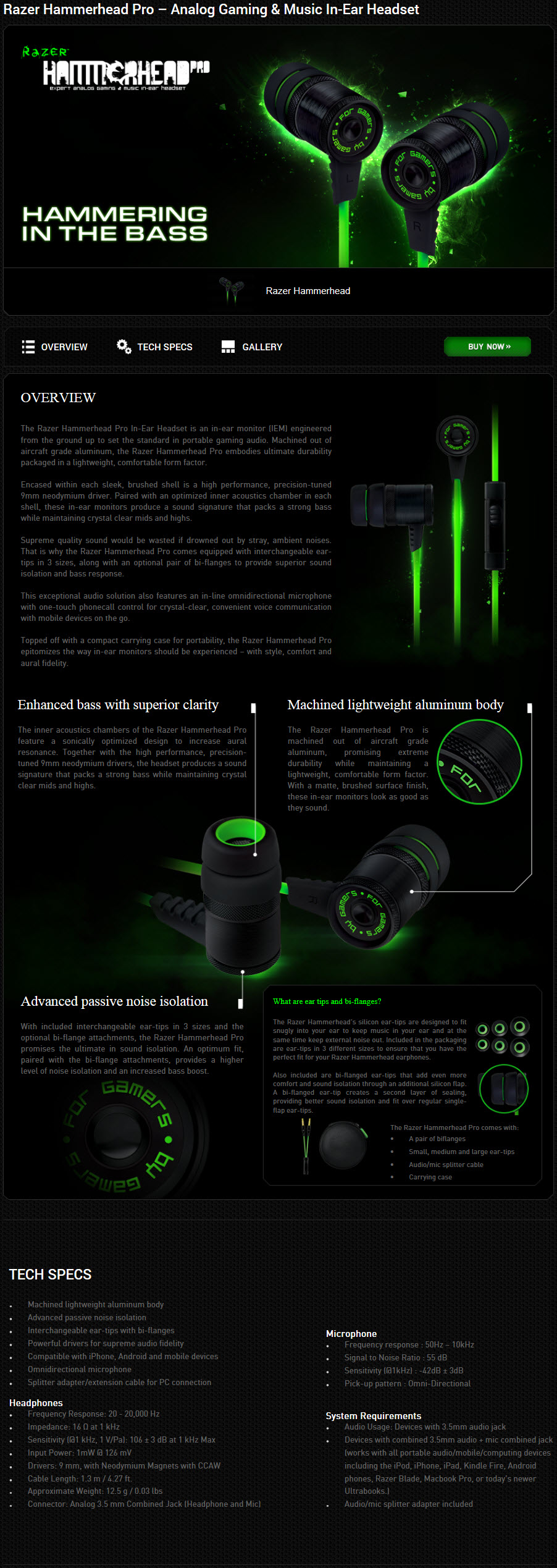 สำหรับวันนี้เราจะมาพูดถึง Gaming Headset จากค่าย Razer อันอีกรุ่นนึงครับ รุ่นที่ว่าก็คือ RAZER HAMMERHEAD PRO Analog Gaming & Music In-Ear Headset ชื่อรุ่นนี่บ่งบอกมาแต่ไกลเลยครับว่าโทนเสียงจะเป็นแบบไหน แต่ก่อนจะไปชมรายละเอียดต่างๆ เราไปชมรายละเอียดจากหน้าเว็บของ Razer กันก่อนครับ