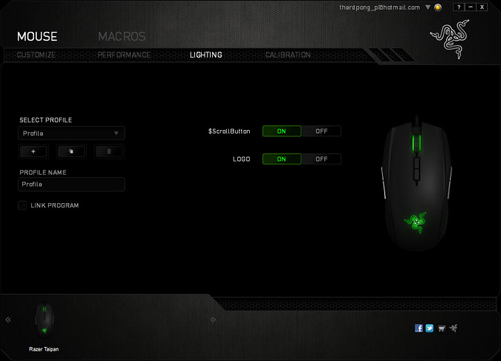 เลือกเปิดหรือปิดแสงที่ตัวเมาส์ได้สองจุดครับคือบริเวณสกอล์หรือบริเวณโลโก แสงสีนี่จะเป็นสีเขียวเท่านั้น