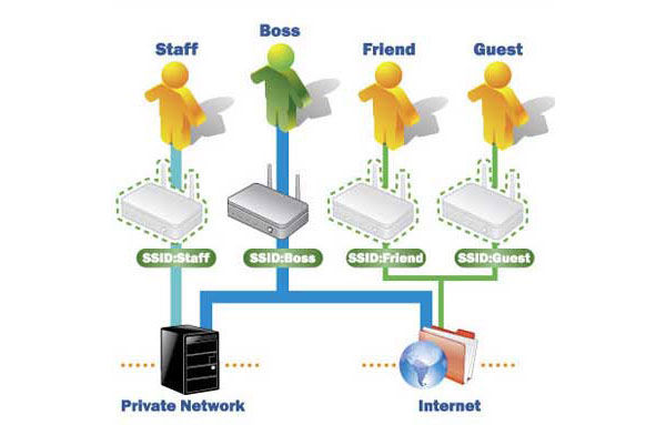 ...ส่วนด้านซ้ายสุดจะเห็นเมนูหลัก ตรงนี้ขยายความคำว่า guest network เลยก็คือตัว RT-AC66U นี้สามารถสร้าง guest network หรือ SSID ของตัวไวเรสเพิ่มขึ้นได้สูงสุด 3 ชื่อ ซึ่งการสร้าง SSID (ซึ่งมันคือชื่อ wireless connection) เพิ่มขึ้นมาได้เยอะๆนั้นก็มีข้อดีที่ทำให้เราสามารถแบ่งสันปันส่วนทรัพยากรในเครือข่ายของเราให้กับกลุ่มผู้ใช้แต่ละกลุ่มได้อย่างง่ายดาย ดังภาพด้านบนนั้นเองครับ