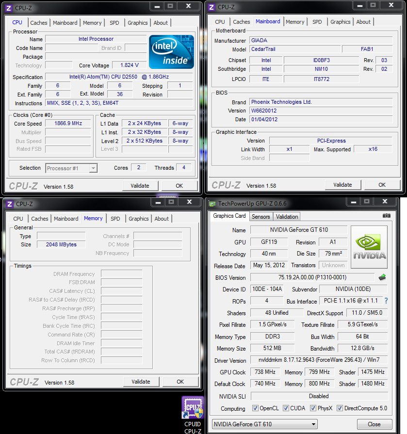 รายละเอียดดูกันให้ชัดเจนสำหรับซีพียู Atom D2550 ซึ่งก็จะเห็นว่ารายละเอียดนั้นก็ไม่ได้ต่างจาก Atom รุ่นแรกๆเท่าไหร่ คือการมี L2 Cache ขนาด 512Kb ทั้งสองคอร์ รวมกันเป็น 1Mb ครับ แต่ใช้เทคโนโลยีการผลิตที่ดีขึ้นนั้นเองครับ ส่วนกราฟฟิค GeForce GT610 ก็รองรับเทคโนโลยีใหม่ๆอย่าง Direct X11 ครับ