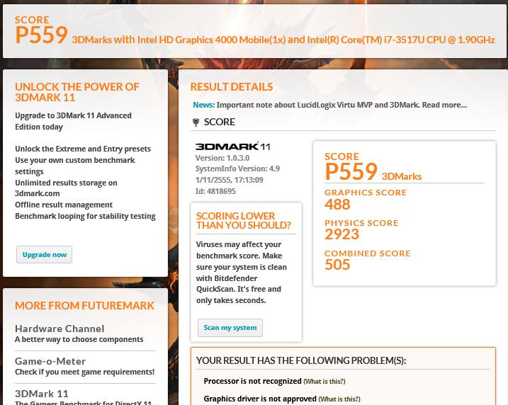 คะแนนของ 3Dmark ก็เรียกได้ว่าพอถูไถใช้งานได้ครับ เรียกได้ว่ากำลังส่วนใหญ่มาจากซีพียู i7 เสียทั้งนั้นเลย เท่านี้ก็สามารถใช้เล่นเกมออนไลน์พื้นๆ ตลอดจนเกมเก่าๆช่วงยุคปี 2007-2009 ได้อย่างลื่นไหลแล้วครับ